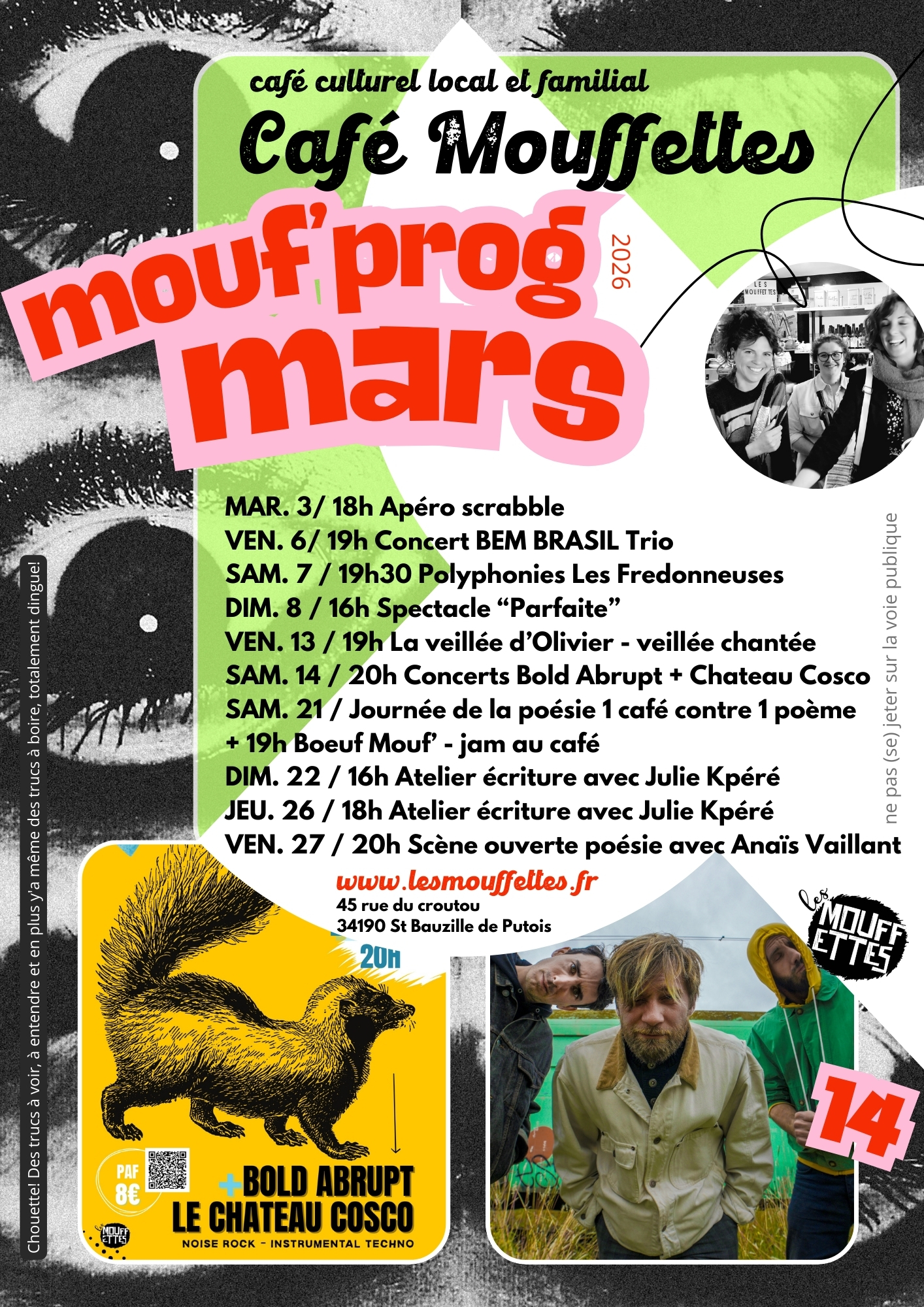 Les mouffettes proposent tous les samedis soirs une programmation artistique et culturelle. Concerts, spectacles, art de rue, cabinet de curiosité, vous y trouverez forcément une soirée à votre gout! Quelques planches saveurs sont servies au comptoir. En semaine c’est une programmation socioculturelle que l’on y trouve, des rencontres d’auteurices, café papote, jeux de société, ateliers … Et sur les murs du café, vous découvrirez des expositions différentes tous les 3 mois mettant à l’honneur des artistes du coin.